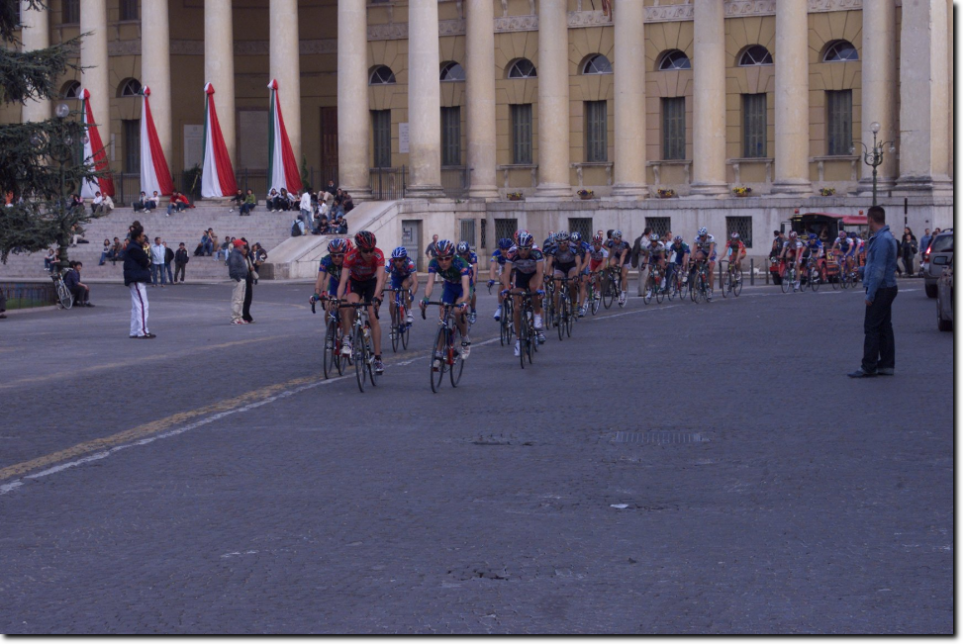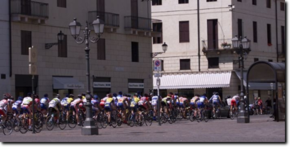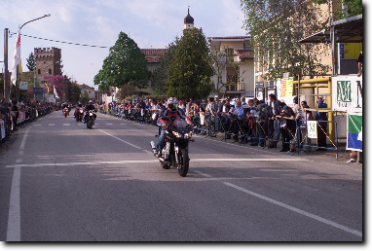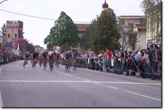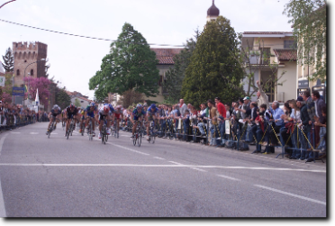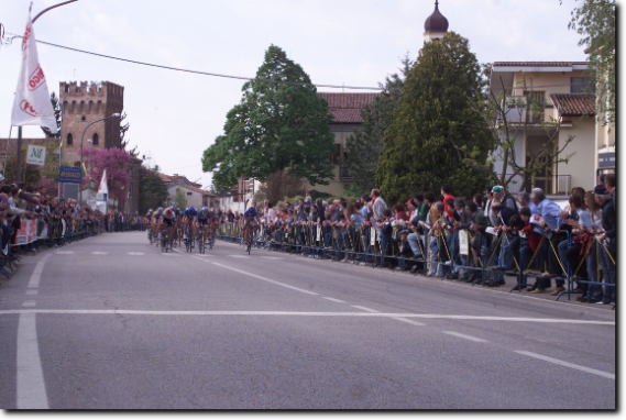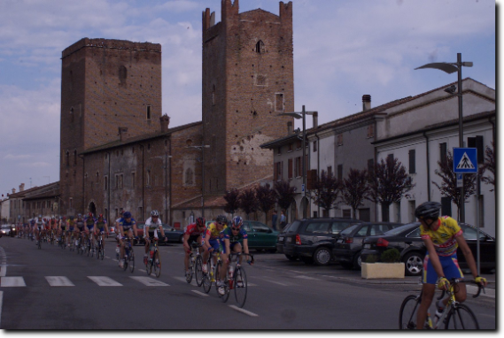 Il castello scaligero fa da sfondo al gruppo che attraversa il centro abitato di Salizzole. Mancano poco più di tre chilometri prima di giungere a Bionde.