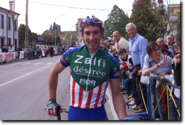 Un raggiante Gianluca Geremia scende dalla bicicletta dopo 170 km di gara e raccoglie il meritato applauso della folla.