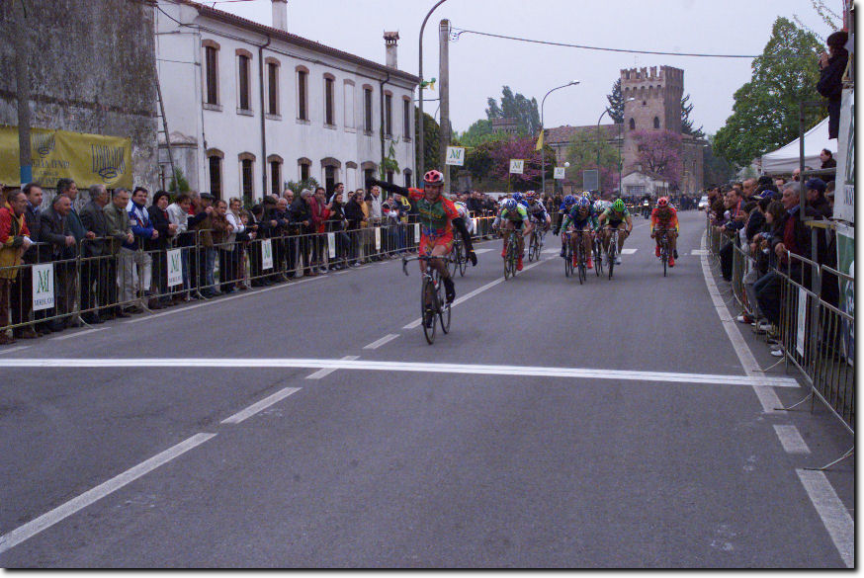 L'arrivo a braccia alzate di Daniele Di Nucci, una volata perentoria, lunga 500 metri che non lascia spazio a nessuno. Sullo sfondo vediamo il secondo classificato Peres Machado (G.S. Marchiol - IMA - Famila) mentre, ormai rassegnato, si gira a controllare la posizione del terzo classificato Jonathan Righetto (Trevigiani Dynamon). Foto Malaffo