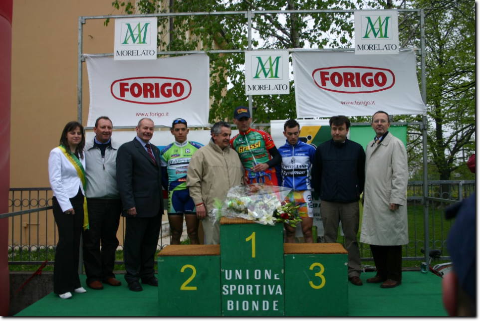 E puntuale Di Nucci fa valere la legge del più forte con una volata che non lascia spazio a repliche e gli consente di alzare le braccia al cielo con tutta tranquillità. Alle sue spalle un indomito Machado (G.S. Marchiol) conquista meritatamente la piazza d'onore su Caneschi (G.S. Grassi M. Pantani) che con il terzo posto completa la giornata trionfale del proprio sodalizio sportivo. Il podio è tutto per Di Nucci e la bella Miss Corsa 2005 Chiara Rossetti. Un pensiero vola a ricordare il Dott. Renato Chiaramonte che da qualche parte ha sicuramente visto la gara e fatto i complimenti al Presidente dell'U.S. Bionde Filippo Scipioni ed ai suoi collaboratori.