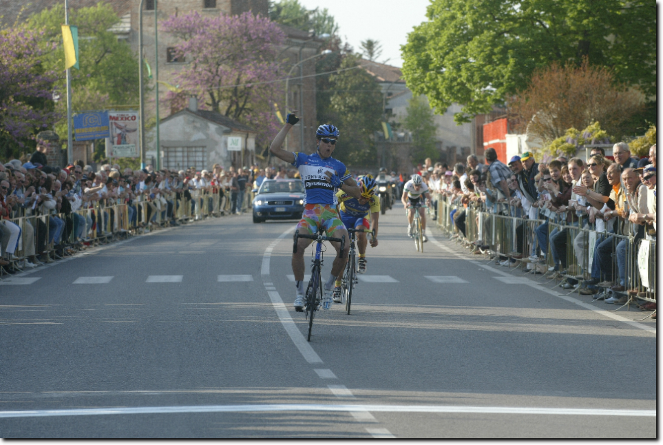 Intanto Davide Beccaro rimane sornione alla ruota, non ha nulla da perdere ed è consapevole che dovrà giocare tutta la partita da solo. L'occasione buona arriva all'ultimo Km con la caduta di Masiero e Bisello (si rialzano subito). Beccaro scatta come una molla, ci crede, e guadagna una ventina di metri su Coss che rinviene e gli arriva vicino, ma poi cede e viene superato da Kalmuratov. Ma ormai è solo una lotta per il secondo posto, Davide tocca il cielo con le mani, la Vicenza-Bionde dei suoi sogni è finalmente sua.