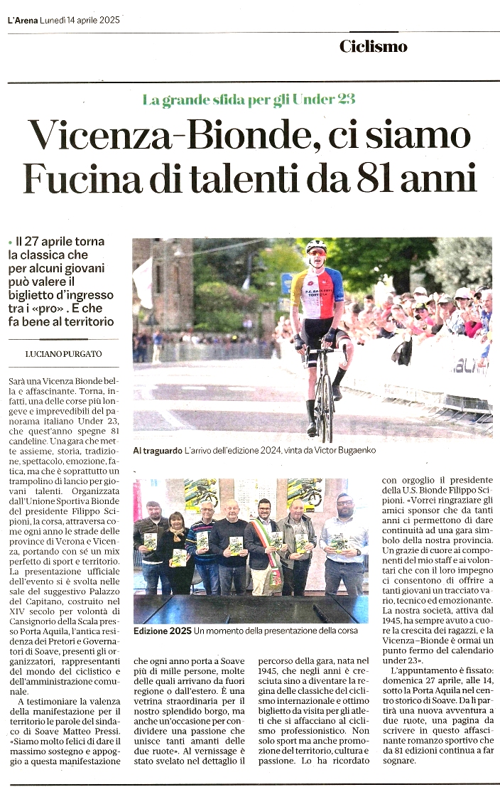 Il grande giorno sta per arrivare, l’adrenalina è pronta a salire, i pedali a girare vorticosamente, il cuore a battere forte: domenica 26 aprile 2026 vi aspettiamo per vivere tutti insieme l’emozione della 82^ Vicenza-Bionde. Sarà una grande sfida tra trenta squadre con 180 corridori, ed i migliori talenti nazionali della categoria Under 23 incluse tre formazioni estere che arriveranno a Bionde da Svizzera - Australia - Spagna.