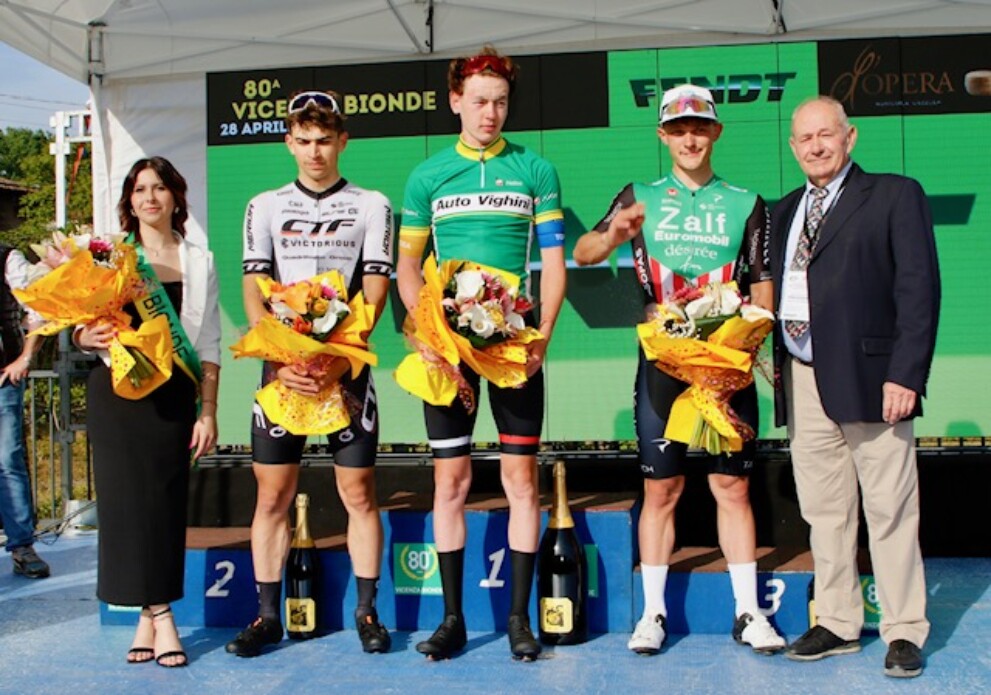 28 Aprile 2024 - Da SX il secondo classificato Thomas Capra (CTF Victorious) il vincitore Viktor Bugaenko (Pc Baix Ebre) ed il terzo classificato Lorenzo Ursella (Zalf Euromobil Désirée Fior)
