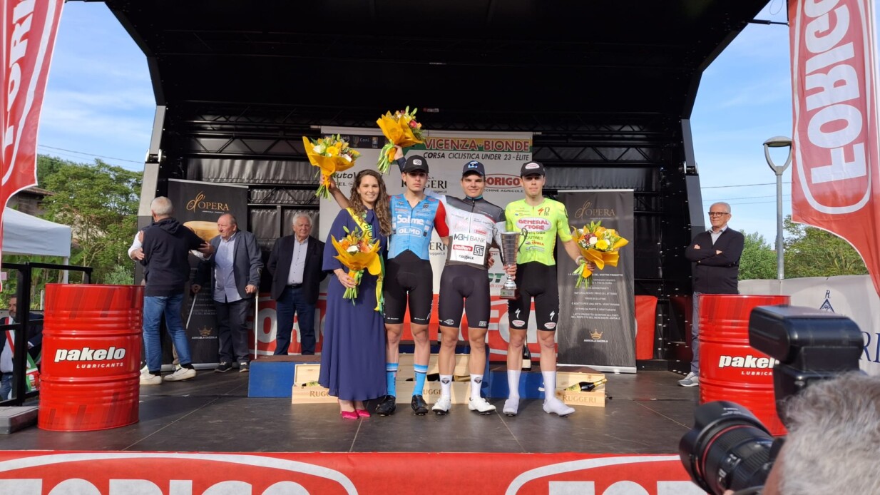 27 Aprile 2025 - Il magnifico podio della 81^ Vicenza-Bionde con Miss Corsa Federica Forigo, il 2° Classificato Christian Fantini (Solme-Olmo), il vincitore Matteo Fiorin (MBHBANK - Ballan CSB Colpack) ed il terzo classificato Alessio Menghini (General Store SGB F.lli Curia).