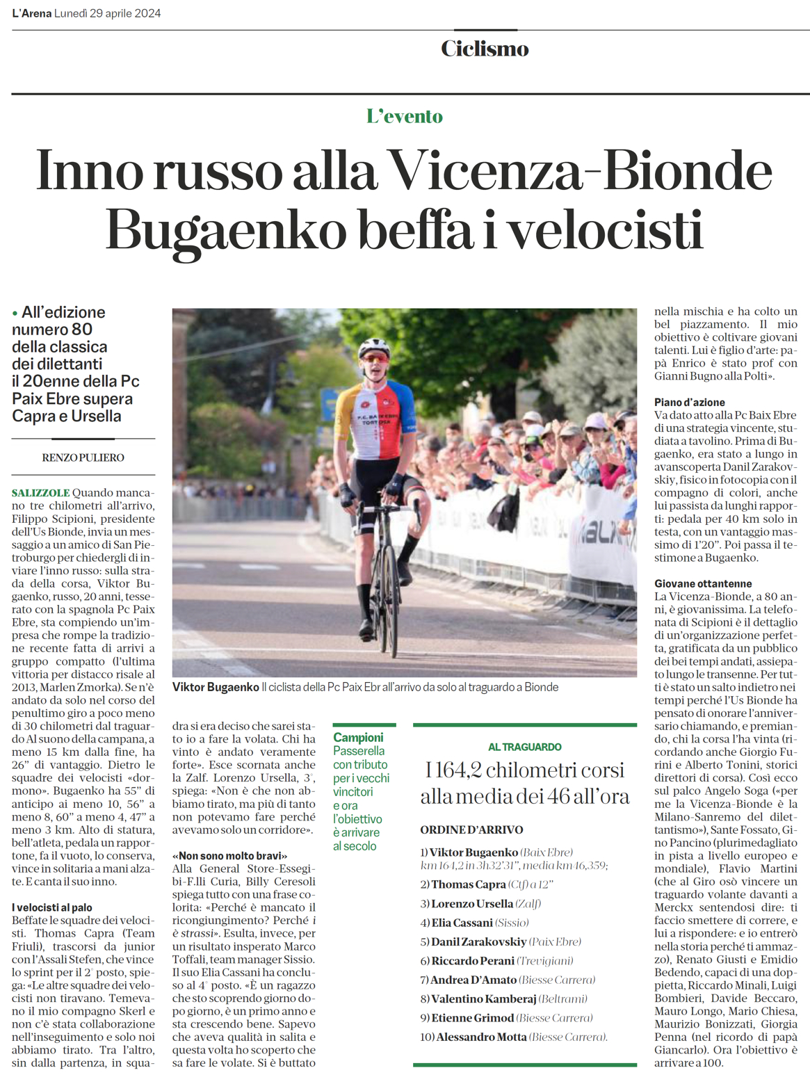 LE DICHIARAZIONI – Largo sorriso per Viktor Bugaenko, che ripete così l’impresa già firmata in passato dal connazionale Lev Gonov: “La nostra squadra ci tiene particolarmente a questa gara e anche oggi abbiamo cercato di interpretarla nel migliore dei modi. Siamo rimasti al coperto nei primi cento chilometri e, quando siamo arrivati sul circuito finale abbiamo cercato in tutti i modi di fare la differenza. E’ andata bene a me, sono felice di essere riuscito a resistere al ritorno del gruppo”.
