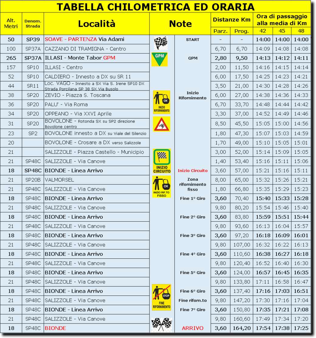 Da SOAVE, la gara transiterà per il territorio di Cazzano di Tramigna. Lo straordinario spettacolo dei vigneti adagiati sulle colline non potrà essere motivo di distrazione per i corridori che dovranno affrontare la breve salita del Monte Tabor dove, a 265 mt di altezza è posto il G.P.M. Questa sarà la prima occasione per i coraggiosi che vorranno tentare la fuga verso il traguardo di Bionde ancora lontano. Una discesa velocissima esalterà i più abili a disegnare le traiettorie tra i tornanti che portano a fino ad Illasi, e giù fino alla riconquista della pianura con il ritorno sulla S.R. n. 11 a Vago, dove si prosegue per Zevio, Palù, Oppeano, Villafontana, Bovolone, Crosare, fino all'ingresso nel capoluogo di Salizzole dove inizierà il circuito finale (Bionde, Valmorsel, Salizzole, Bionde) di 13,4 Km, da ripetere otto volte per un totale di Km 164,20 complessivi.