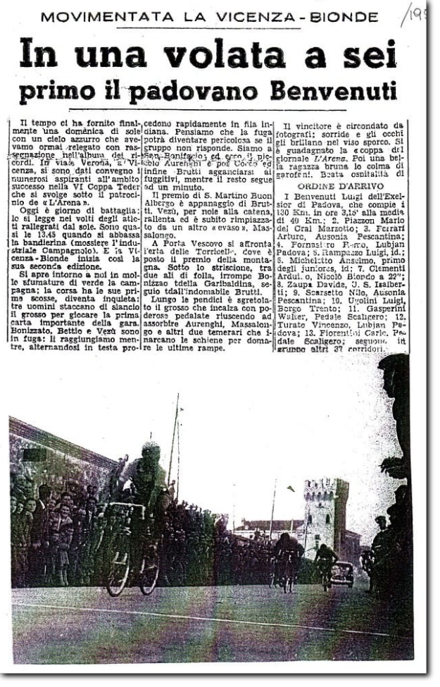 Nogara. «Era settembre 1945. Bastava girare lo sguardo e dovunque apparivano i segni della guerra finita da pochi mesi: case bombardate o mitragliate, ponti distrutti, e in migliaia e migliaia di cuori un peso di assenze e attese per chi non era ancora tornato. Conosco la gente della Bassa: in quei luoghi sono nato e ho vissuto a lungo. È gente d’animo forte, che sa reagire alle insidie della rassegnazione. Penso che l’idea di organizzare la Vicenza-Bionde sia nata come una sfida. Si erano finalmente riaccese le luci nelle strade, parole come oscuramento e coprifuoco sembravano già appartenere a un’epoca remota. Perché non lanciare tra le città e i paesi un plotone di ragazzi pieni di speranze, curvi sul manubrio, sconosciuti protagonisti di una domenica? Era il primo autunno di pace, e una corsa era pur sempre un simbolo di pace». Così scrive il giornalista Giulio Nascimbeni, ricordando la nascita di quella che sarebbe diventata, nel corso degli anni, una delle più prestigiose gare del ciclismo dilettantistico veneto e nazionale. Agli albori, questa gara sembrava uno dei tanti circuiti organizzati nei paesi e nelle frazioni per animare la festa del patrono o la fiera, da gente che aveva fretta di tornare alla normalità dopo la parentesi bellica. Il ciclismo, a quei tempi, grazie al dualismo Coppi-Bartali, attirava su di sè l’attenzione della maggior parte degli sportivi. Ritornati dai vari fronti, molti atleti, anche a livello dilettantistico, salirono sulla bicicletta e ricominciarono a gareggiare. Come il nogarese Arduino Clementi, classe 1920, reduce dalla tragica campagna di Russia, che è stato uno dei protagonisti delle prime Vicenza-Bionde e, con 55 vittorie in carriera, uno dei più forti dilettanti del Basso Veronese di sempre. «Ricordo ancora il gruppo di appassionati di Bionde che venne a chiedermi dei suggerimenti per organizzare una corsa», racconta, «A quei tempi io ero abbastanza conosciuto nell’ambiente ciclistico locale, sia perché avevo già vinto delle gare, sia perché, con altri tre dilettanti veronesi, avevo gareggiato con Coppi e Bartali prima della guerra. Fino al 1950 la gara si svolgeva nelle strade secondarie dei paesi e delle frazioni vicino a Bionde e si chiamava "coppa Teder"; solamente in seguito, con la partenza da Vicenza, assunse il nome attuale».